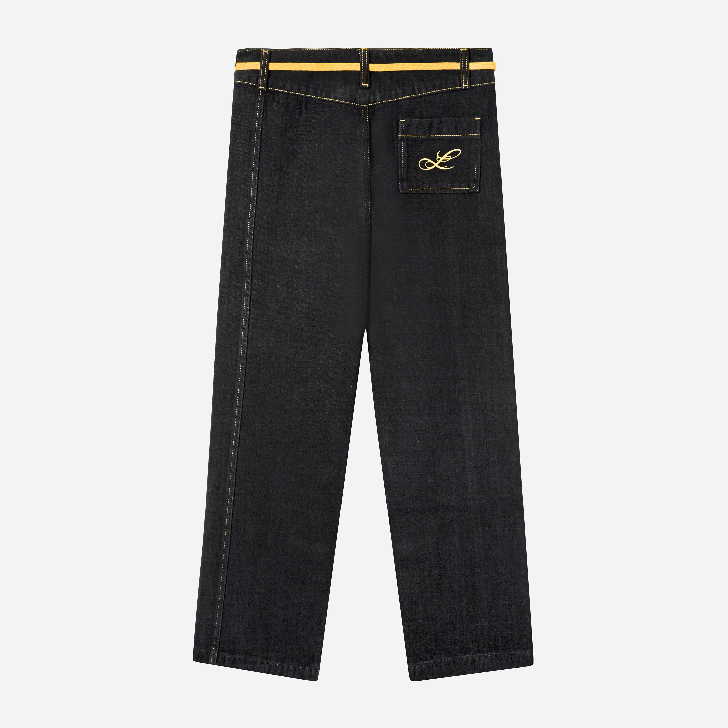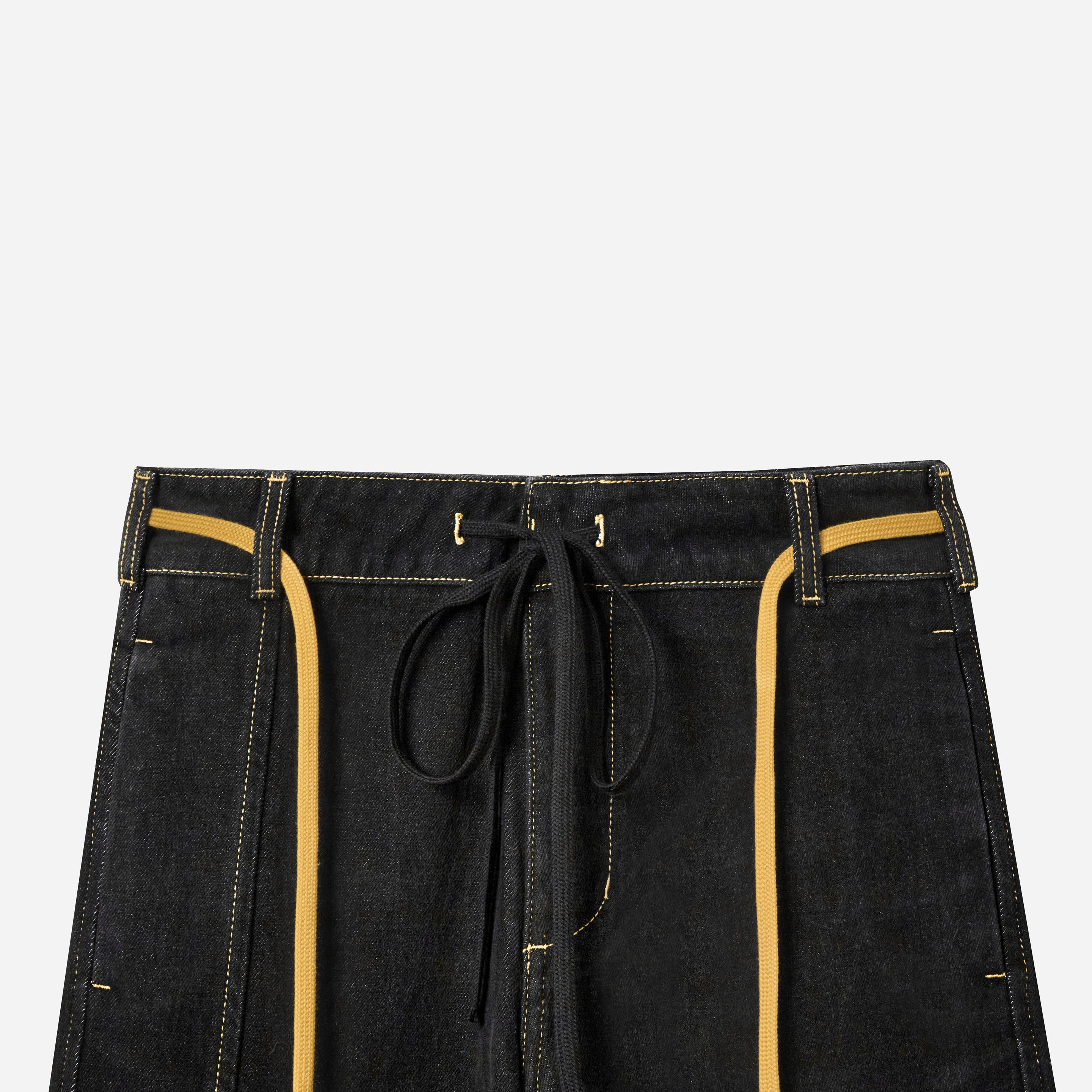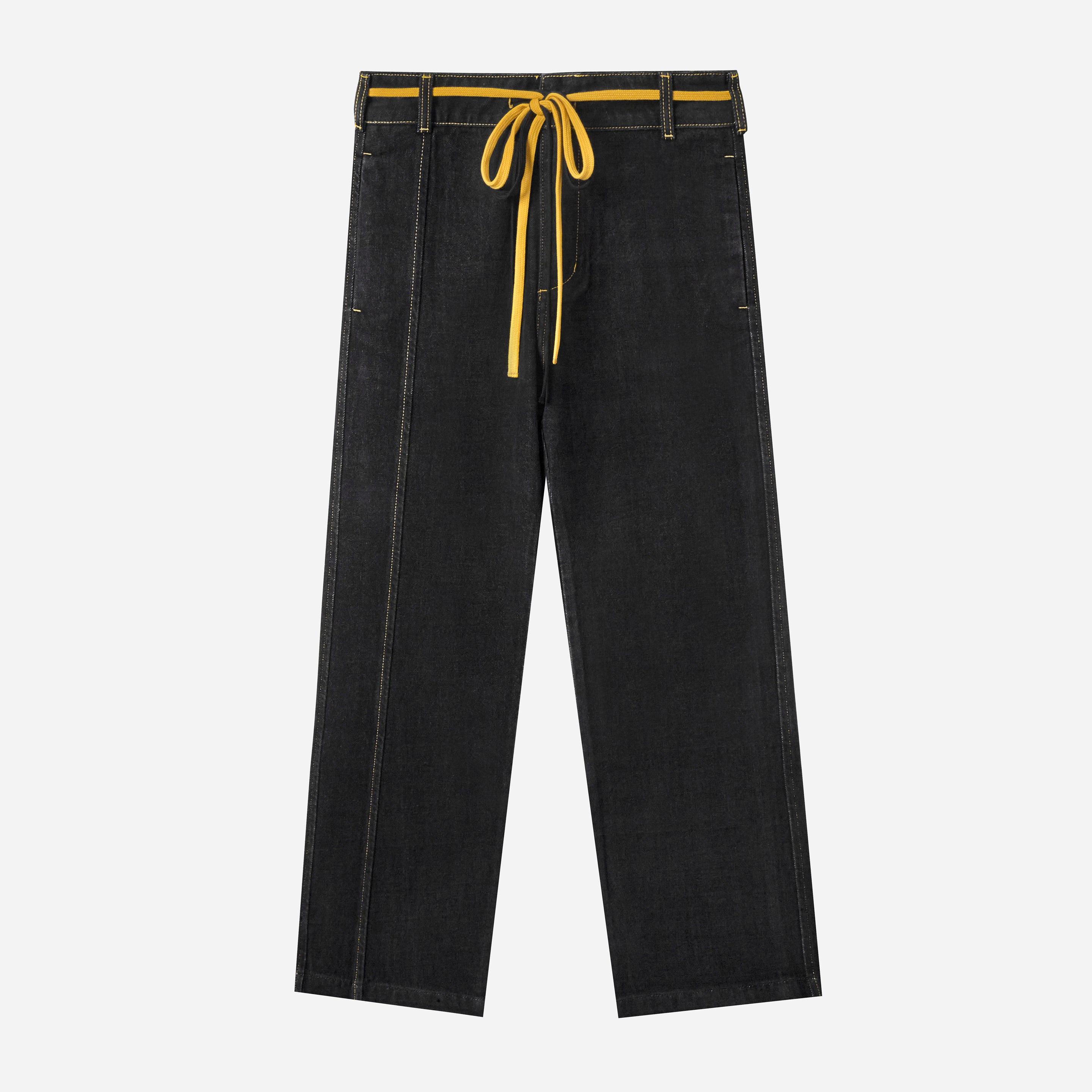 - Black denim - Black drawstring in waistband - Yellow drawstring belt (removable) - Embroidered Double L logo - 100% cotton - Made in South Korea Model info: Enzo is 6'1" and is wearing a size L.