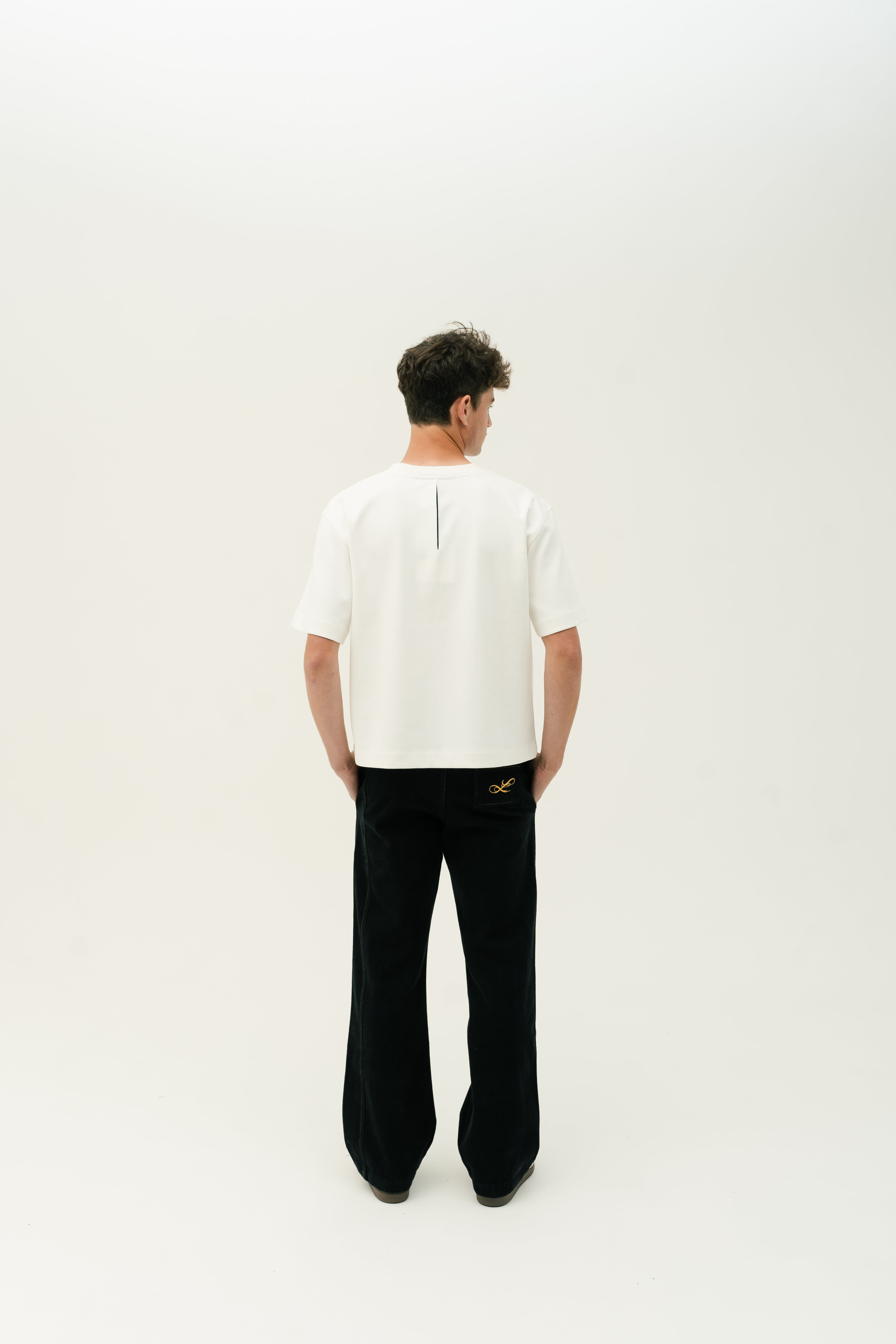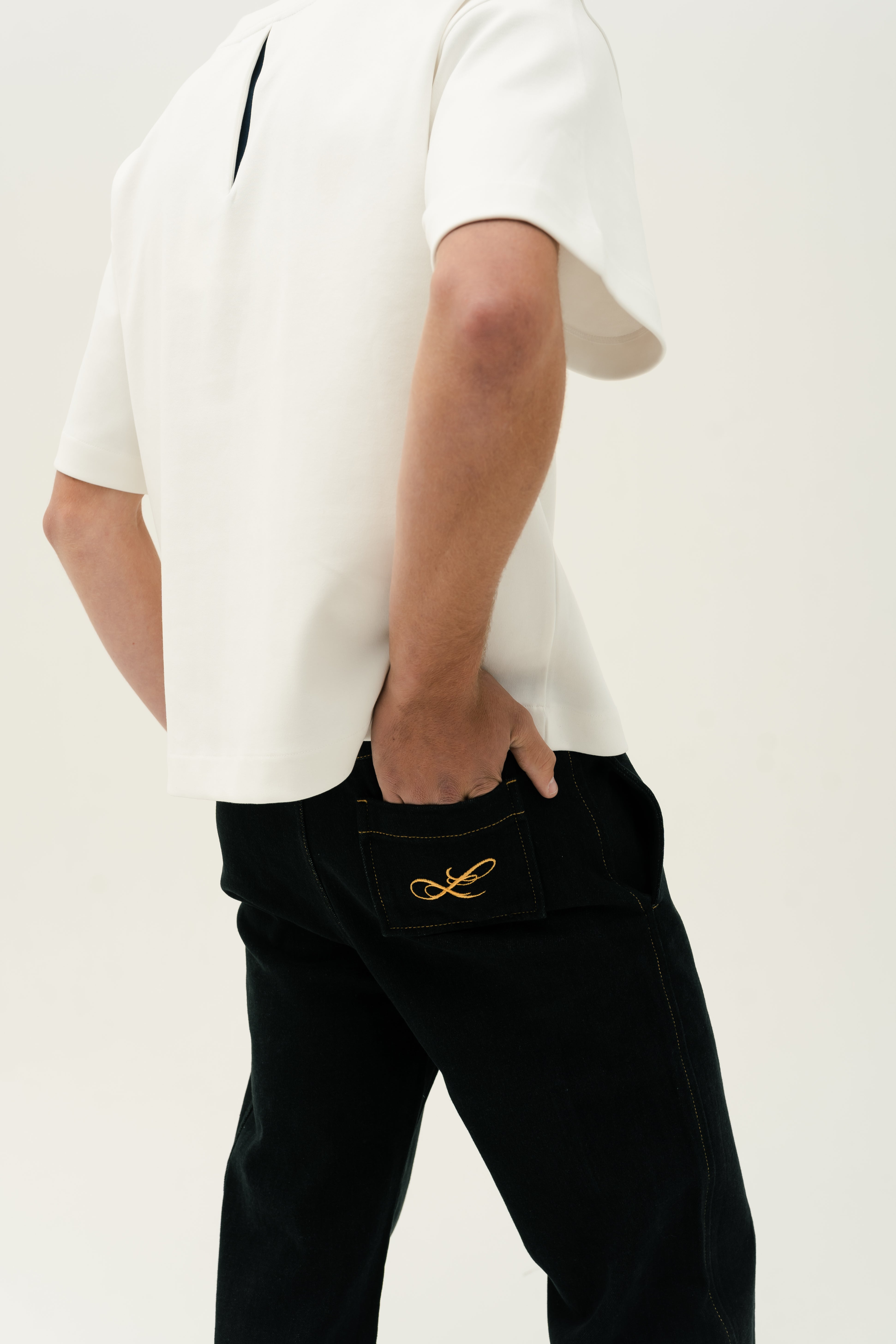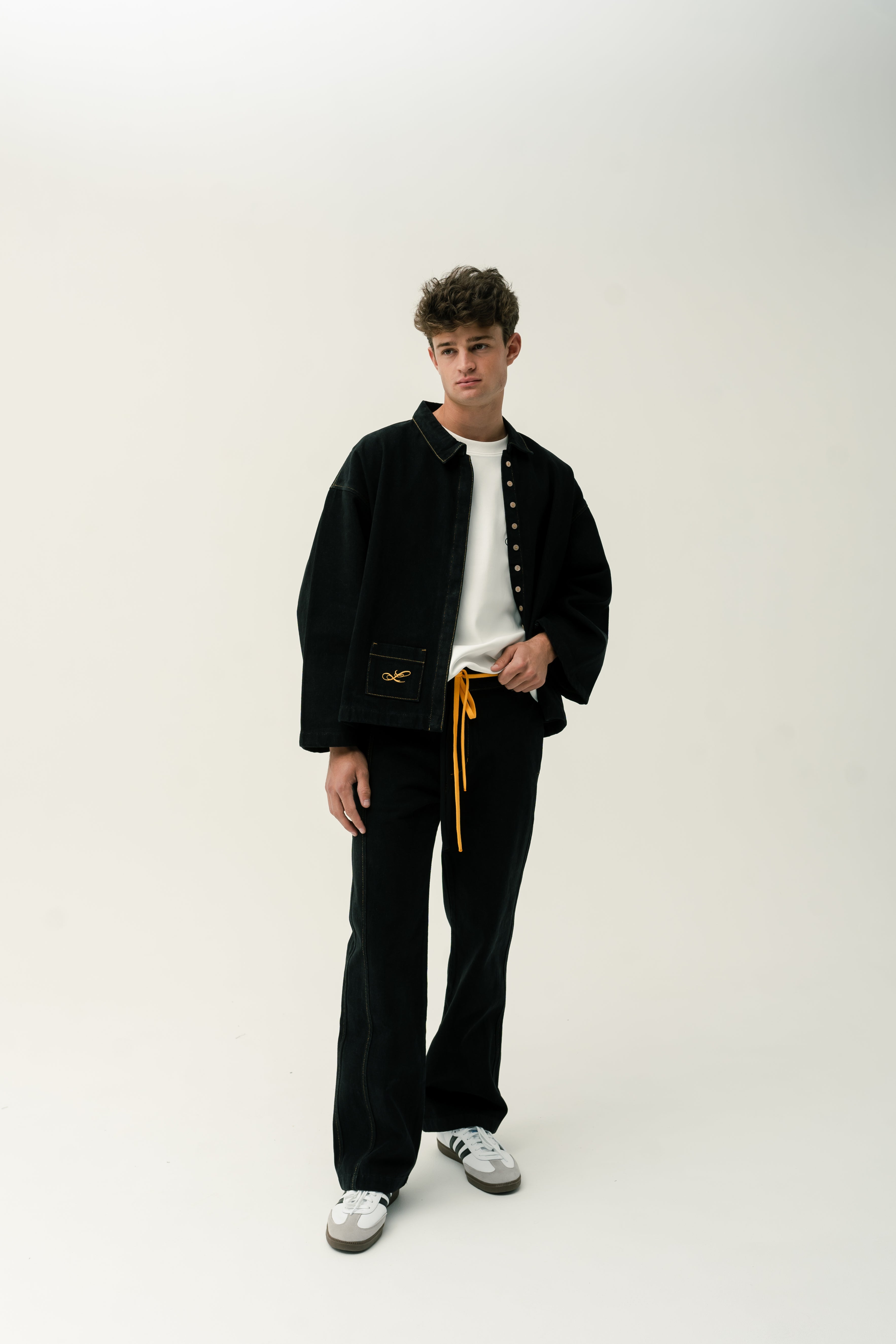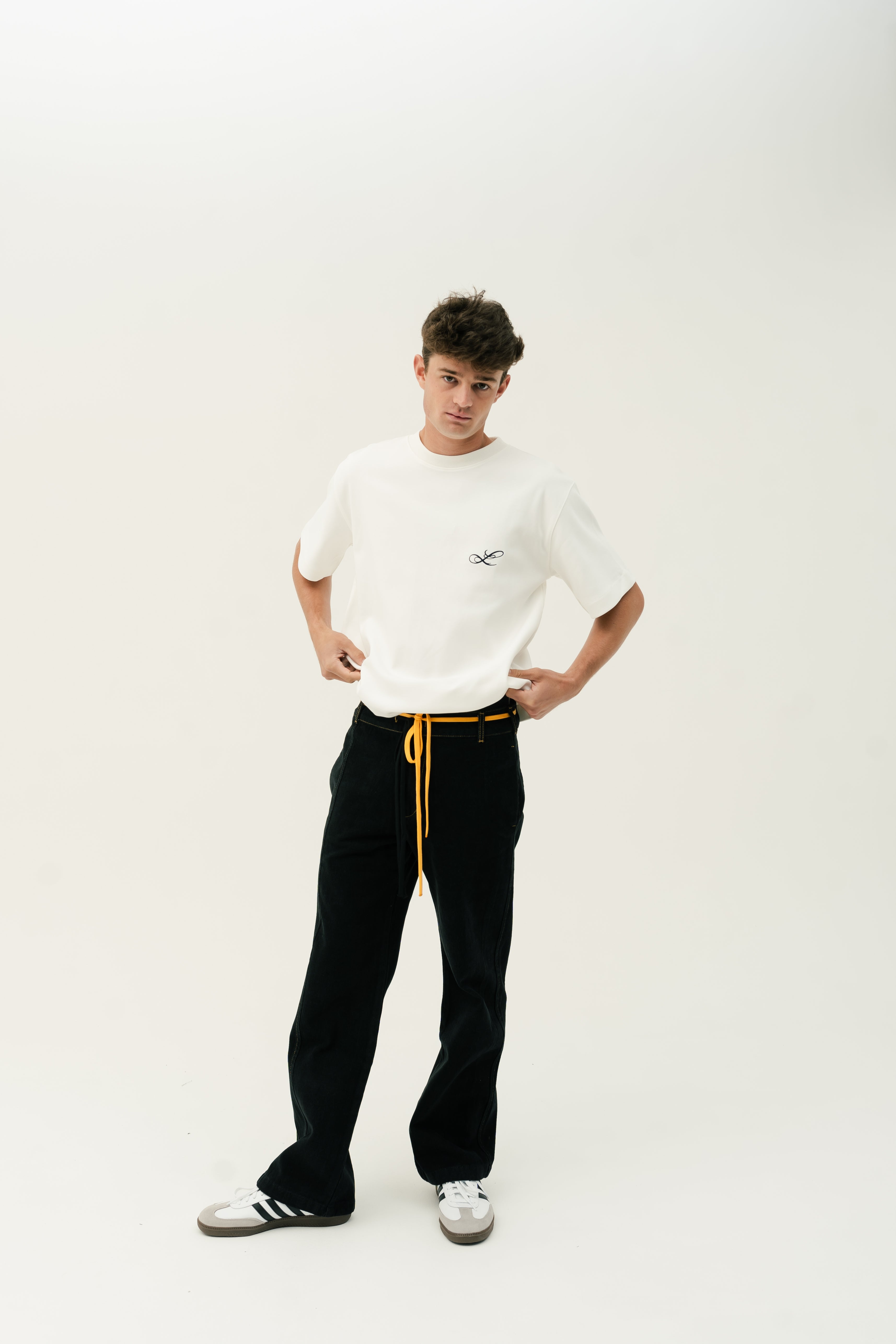 - Black denim - Black drawstring in waistband - Yellow drawstring belt (removable) - Embroidered Double L logo - 100% cotton - Made in South Korea Model info: Enzo is 6'1" and is wearing a size L.